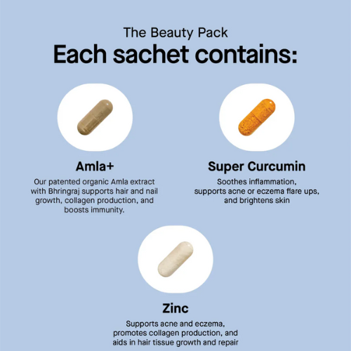 Support radiant skin and healthy hair with our carefully curated sachet of daily capsules.